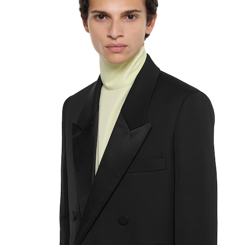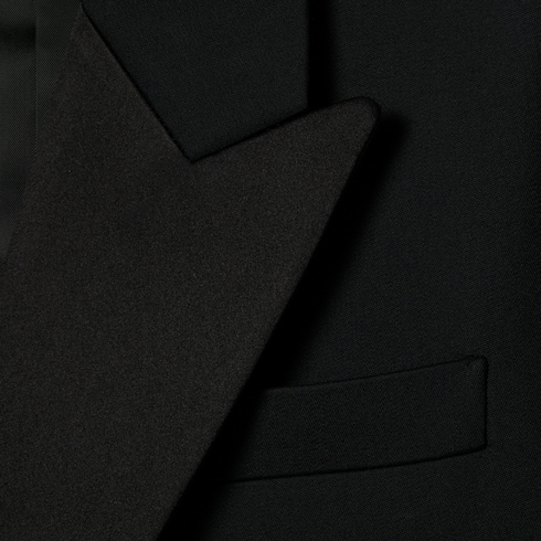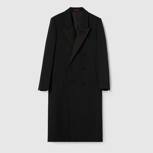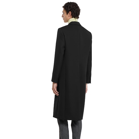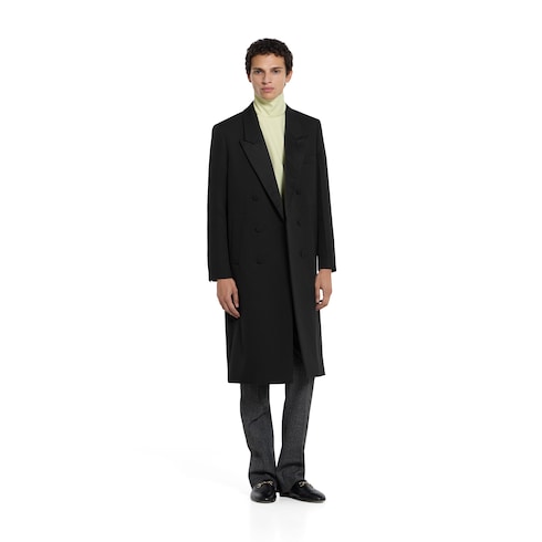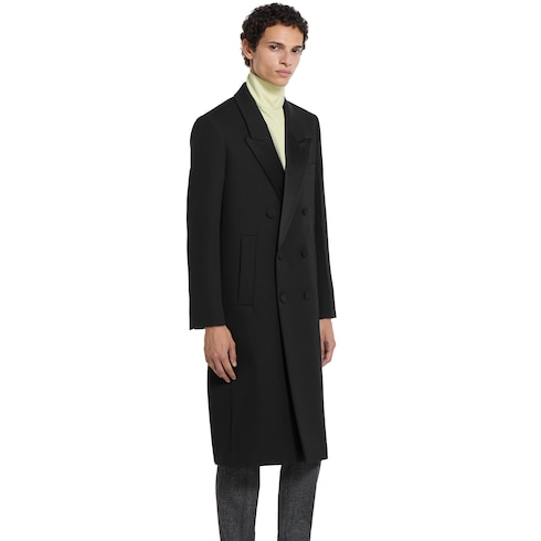 En la colección Otoño Invierno 2025, las líneas básicas y definidas definen los diseños con tejidos refinados y elementos clásicos de sastrería británica. Este abrigo de botonadura doble exhibe solapas en pico y detalles de satén.