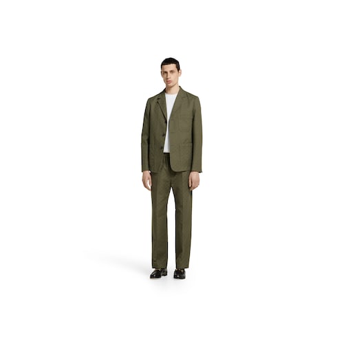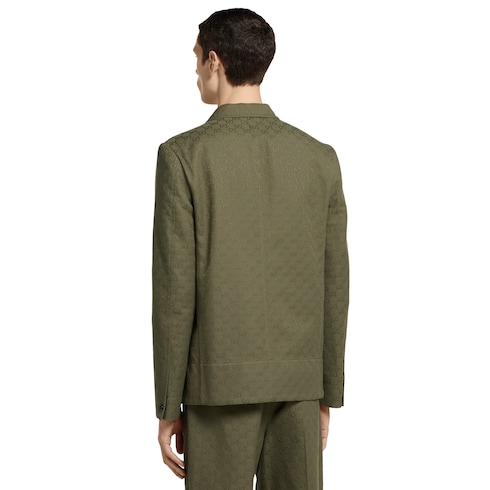 Los diseños de Pre-Fall 2025 en sutiles tonos negros, grises y verdes se destacan con detalles artesanales como delicados bordados florales y logotipos en relieve. Esta chaqueta de botonadura sencilla se ha confeccionado con una mezcla de lona de algodón verde bosque y se completa con el monograma GG.