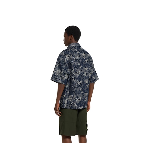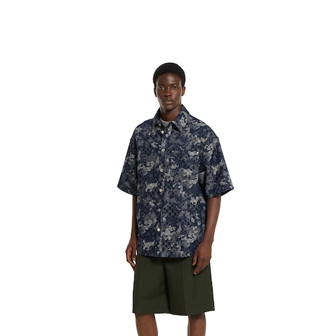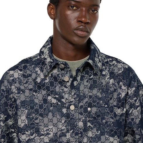 La colección Pre-Fall 2025 cuenta con prendas de denim con intrincados detalles que realzan los looks de diario. Esta camisa confeccionada con jacquard de denim con GG con efecto mármol en azul oscuro y marfil se completa con botones Gucci de metal.