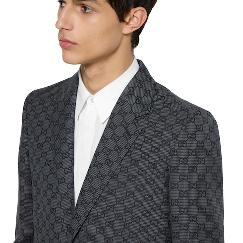 Los diseños de la colección Pre-Fall 2025 en sutiles tonos negros, grises y verdes destacan con detalles artesanales, como los logotipos en relieve. Esta chaqueta de botonadura sencilla está confeccionada en jacquard de lana gingham técnica con GG en gris y negro.