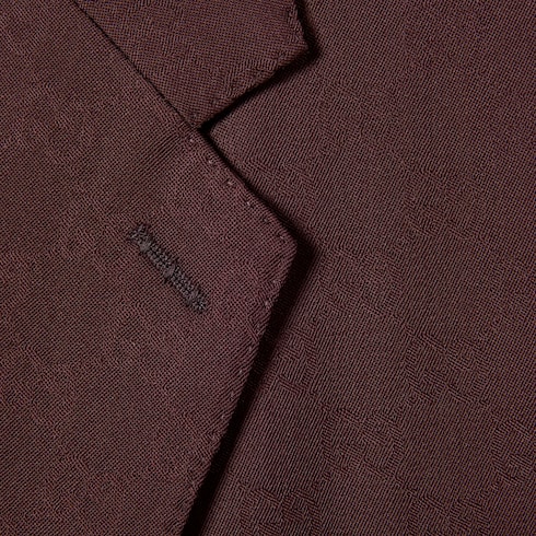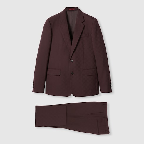 La moda formal inspirada en el mundo del ocio trae nuevos diseños y cortes a la colección Pre-Fall 2025. Los elementos exclusivos se combinan con detalles refinados. Este traje está confeccionado en jacquard de lana con GG burdeos oscuro.
