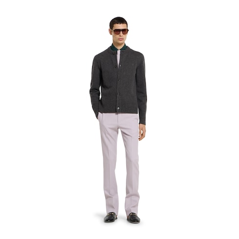 Las prendas básicas de punto de la colección Otoño Invierno 2025 se definen por sus líneas limpias y detalles sutiles. Este cárdigan de manga larga exhibe un cuello redondo, un logotipo de GG entrelazada en relieve y un cierre abotonado clásico en la parte delantera.