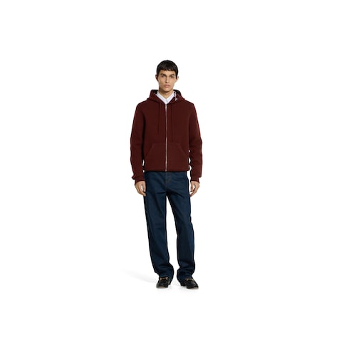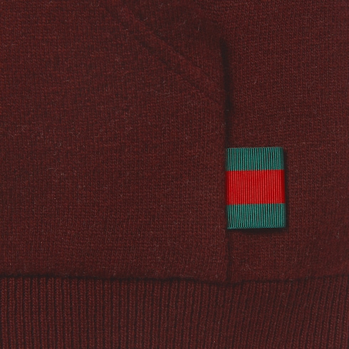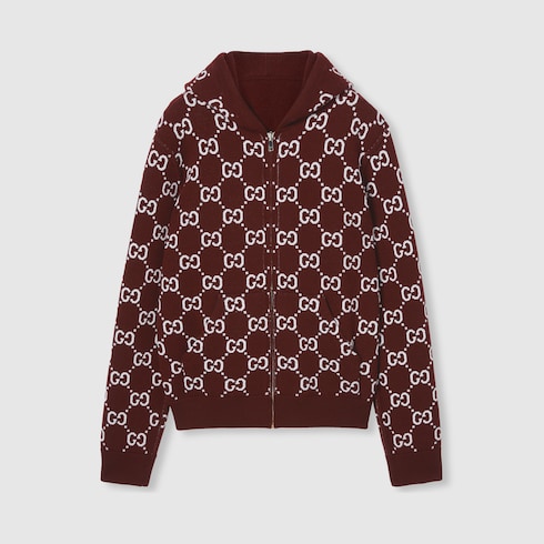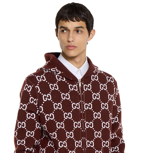 Para la colección , las prendas de abrigo básicas de estilo urbano, como las chaquetas de piel o bomber, combinan sofisticación y materiales lujosos con un toque refinado. Esta chaqueta con cremallera se ha confeccionado en punto de lana color vino y exhibe un reverso de jacquard de lana con GG que se completa con un detalle de tribanda Web exclusivo.