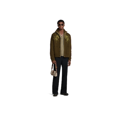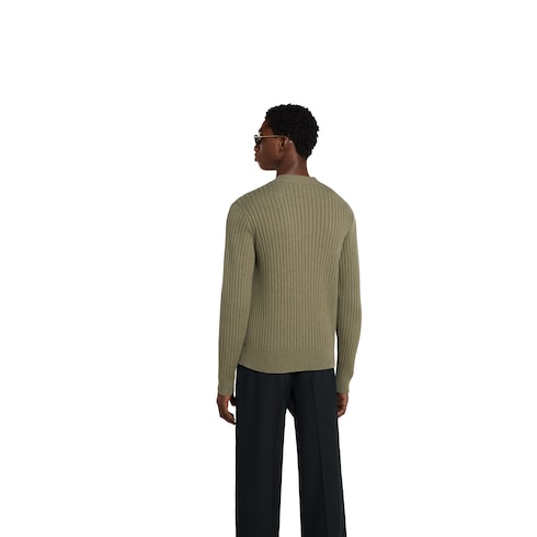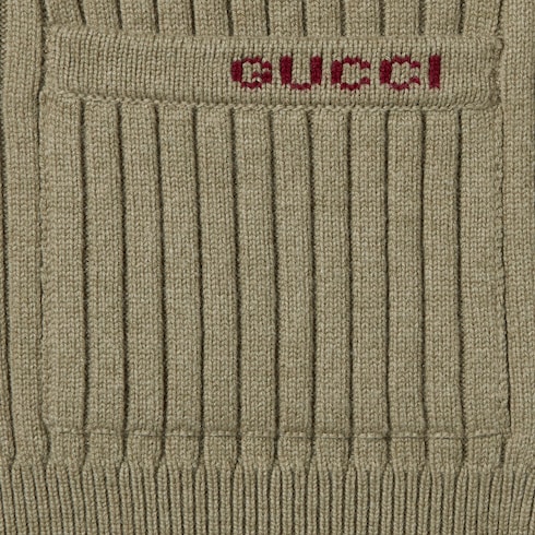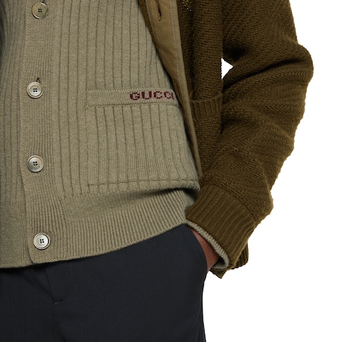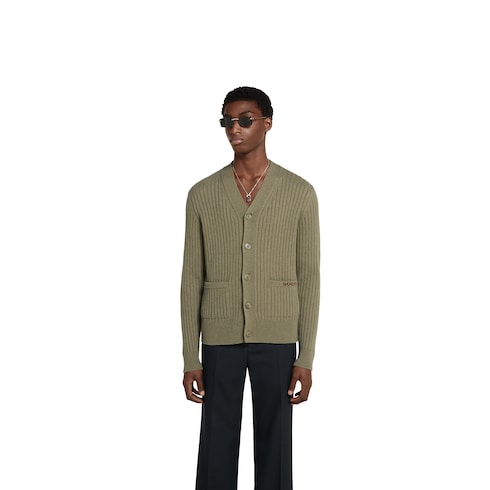 La colección Pre-Fall 2025 destaca por los diseños clásicos de día y de noche con detalles emblemáticos. Este cárdigan de punto acanalado de cashmere y lana en verde claro se realza con una intarsia Gucci.