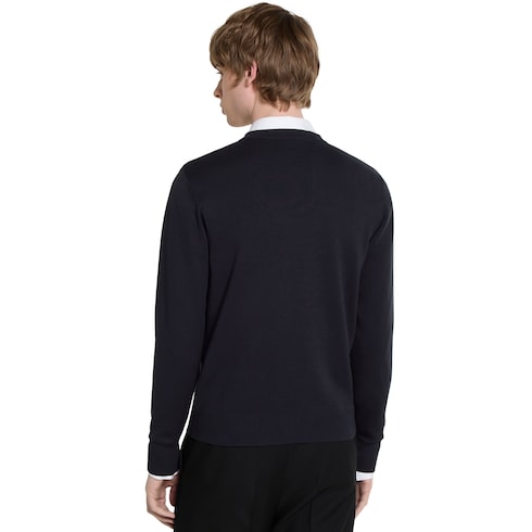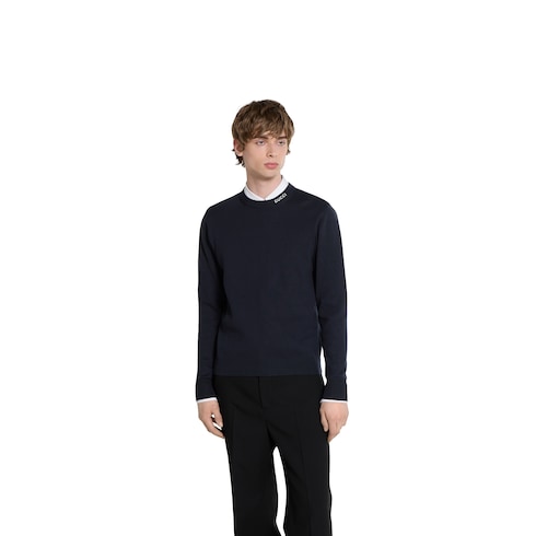 La colección Pre-Fall 2025 destaca por los diseños clásicos de día y de noche con detalles emblemáticos. Este jersey de punto de algodón y seda azul marino se realza con una intarsia Gucci.