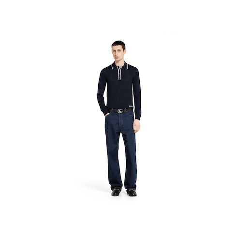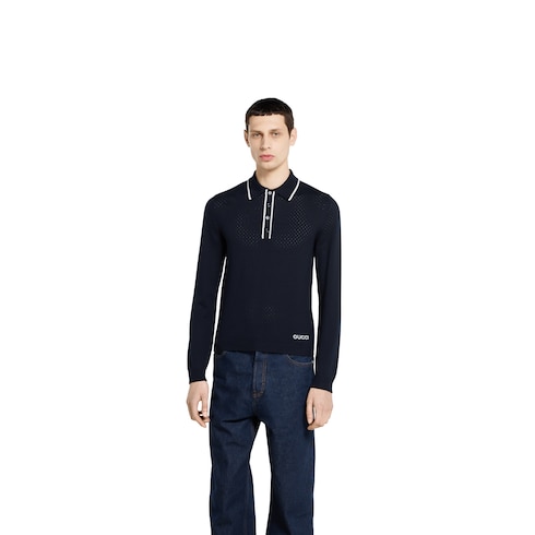 La moda formal inspirada en el mundo del ocio trae nuevos diseños y cortes a la colección Pre-Fall 2025. Los elementos exclusivos se combinan con detalles refinados en prendas como este polo de lana fina perforada con una intarsia Gucci.