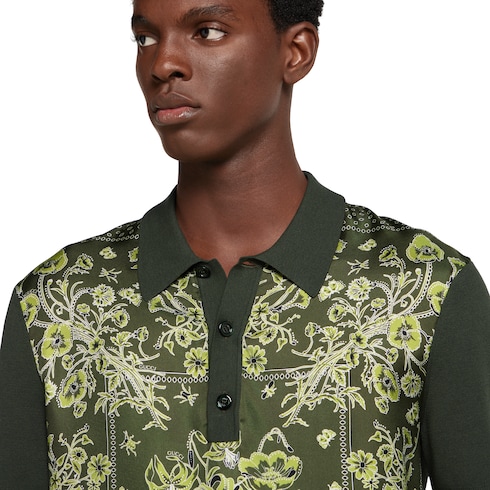 La colección Pre-Fall 2025 incluye una selección de prendas ready-to-wear que destacan por el estilo bohemio con estampados coloridos y las siluetas informales. Este polo se ha confeccionado en punto de algodón y seda verde bosque con un estampado de pañuelo por toda la superficie.