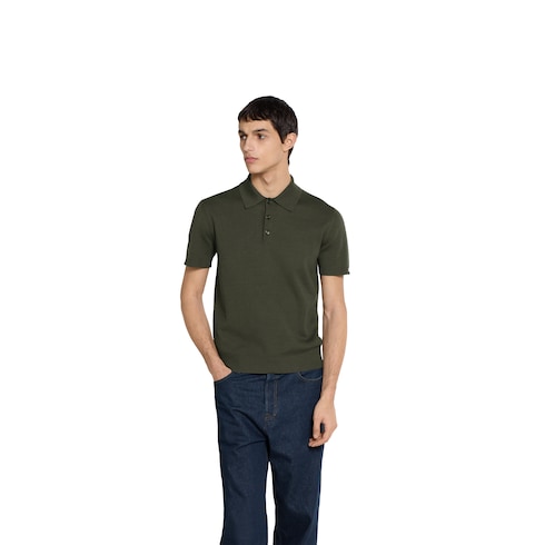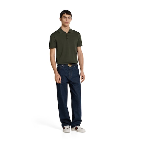 La colección Pre-Fall 2025 destaca por los diseños clásicos de día y de noche con detalles emblemáticos. Este polo clásico se ha confeccionado en punto de algodón y seda verde bosque con una intarsia Gucci en la manga.