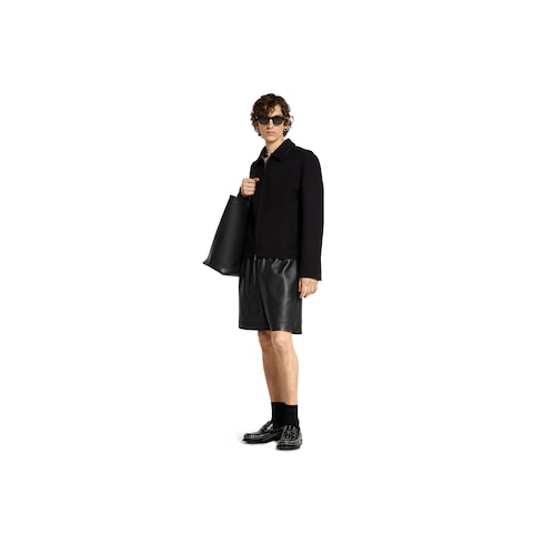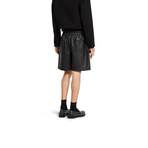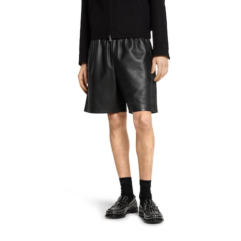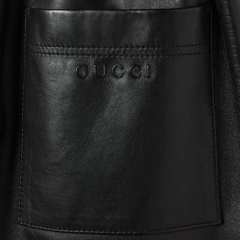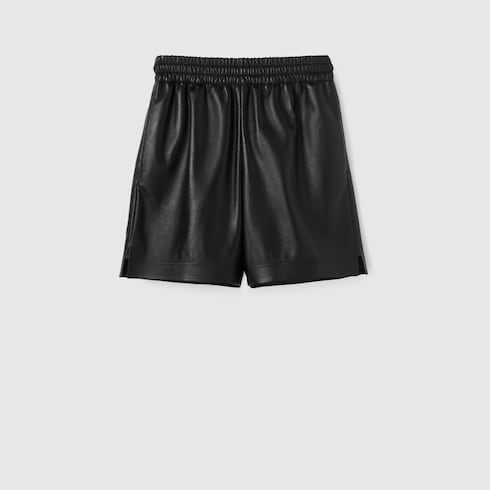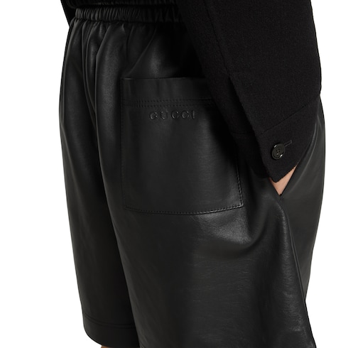 Los detalles clásicos de la Firma se combinan para realzar una selección de prendas ready-to-wear. Estos shorts confeccionados con piel negra adherida se completan con un logotipo Gucci en relieve.