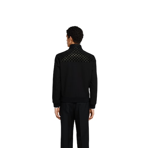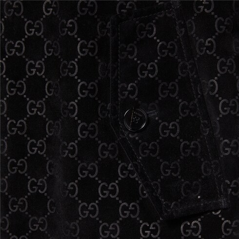 Los diseños de Pre-Fall 2025 en sutiles tonos negros, grises y verdes se destacan con detalles artesanales como delicados bordados florales y logotipos en relieve. Esta chaqueta bomber de ante con GG en relieve negro se caracteriza por tener las mangas y la parte posterior confeccionadas en lona de algodón.