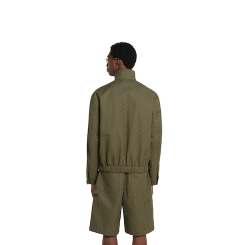 Los diseños de Pre-Fall 2025 en sutiles tonos negros, grises y verdes se destacan con detalles artesanales como delicados bordados florales y logotipos en relieve. Esta chaqueta bomber de lona verde bosque se define por el exclusivo monograma GG.