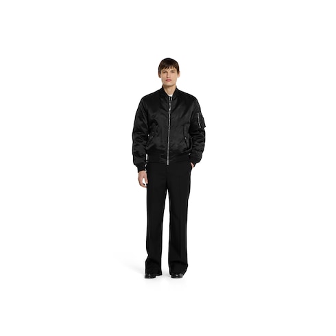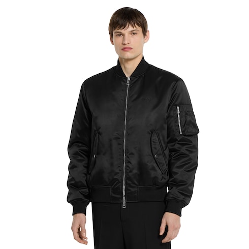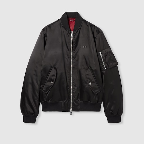 Para la colección Pre-Fall 2025, las prendas de abrigo básicas de estilo urbano, como las chaquetas de piel o bomber, combinan sofisticación y materiales lujosos con un toque refinado. Esta chaqueta bomber de lona de nylon grueso negro cuenta con botones Gucci de metal y con una exclusiva inscripción con letras de metal.