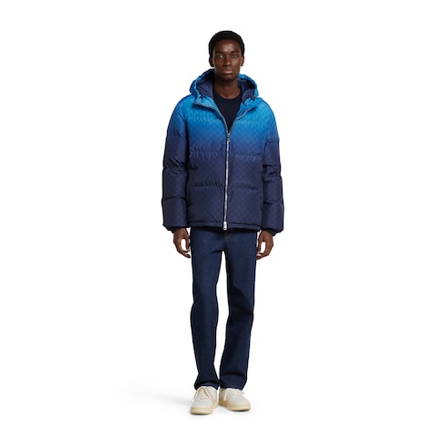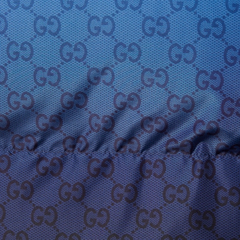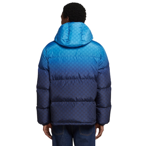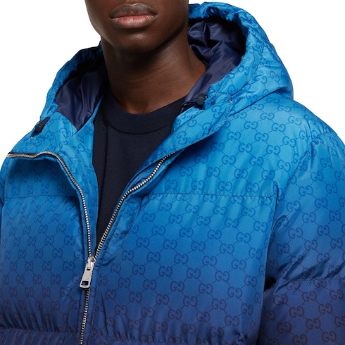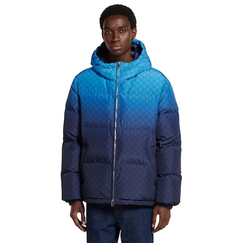 Los colores degradados se crean meticulosamente para resaltar la textura de los materiales y el inconfundible motivo GG. Confeccionada con popelina técnica de poliéster con un degradado de azul claro a azul, esta chaqueta acolchada se caracteriza por un estampado GG integral con efecto degradado.