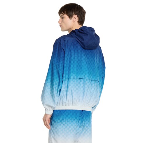 Los colores degradados se crean meticulosamente para resaltar la textura de los materiales y el inconfundible motivo GG. Esta chaqueta plegable con capucha se ha confeccionado en popelina técnica de poliéster azul degradado con un estampado GG integral.
