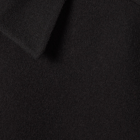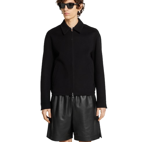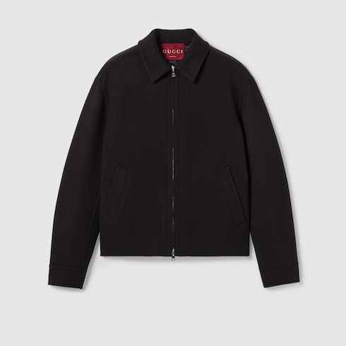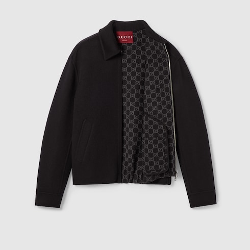 Los diseños de Pre-Fall 2025 en sutiles tonos negros, grises y verdes se destacan con detalles artesanales como delicados bordados florales y logotipos en relieve. Esta chaqueta con cremallera se ha fabricado en lana doble negra y gris, y presenta una confección doble con motivo GG en el interior.
