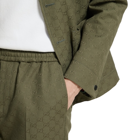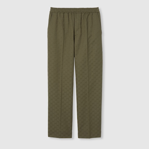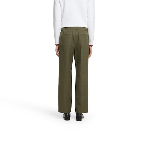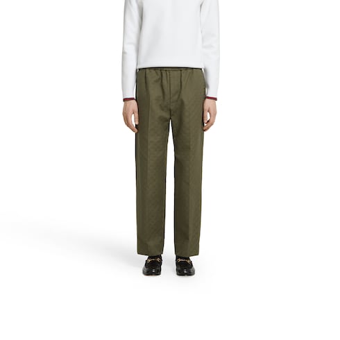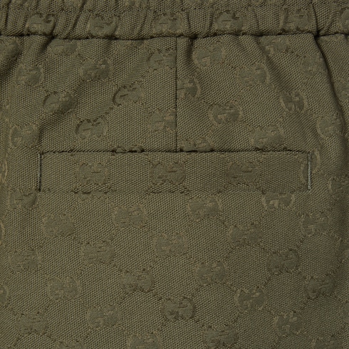 Los diseños de Pre-Fall 2025 en sutiles tonos negros, grises y verdes se destacan con detalles artesanales como delicados bordados florales y logotipos en relieve. Este pantalón confeccionado con lona GG se completa con una cómoda cintura elástica.
