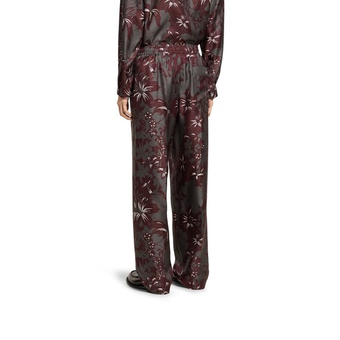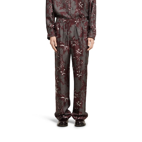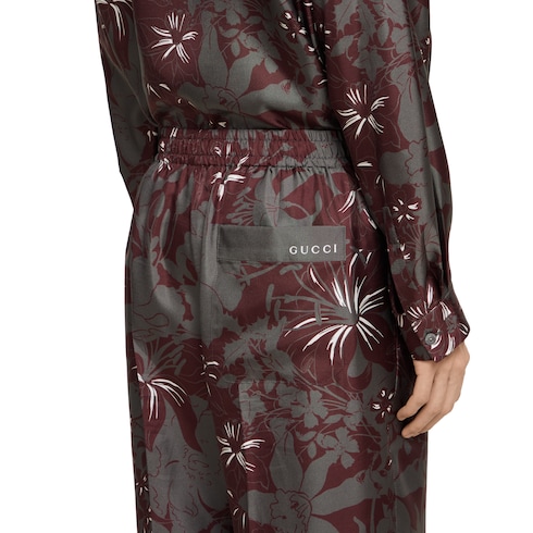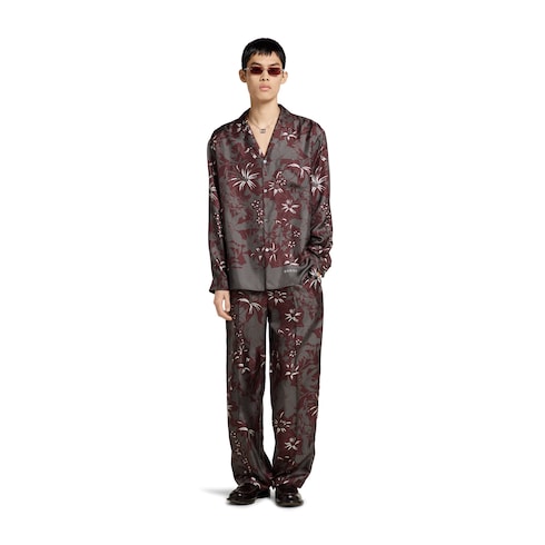 La colección Pre-Fall 2025 incluye una selección de prendas ready-to-wear que destacan por el estilo bohemio con estampados coloridos y las siluetas informales. Estos pantalones se han confeccionado en sarga de seda gris oscuro y marrón con un estampado floral integral y el logotipo Gucci.