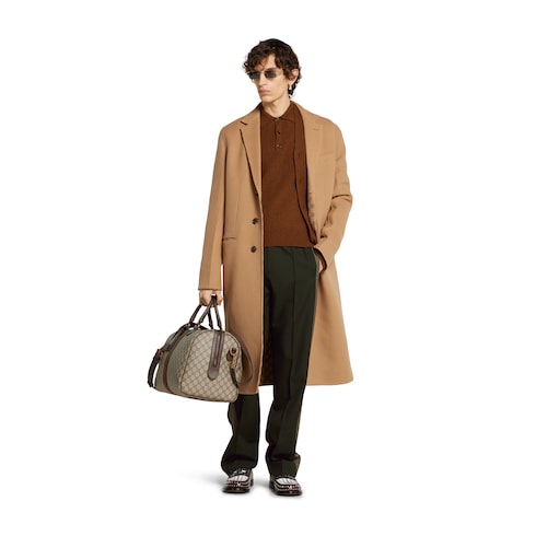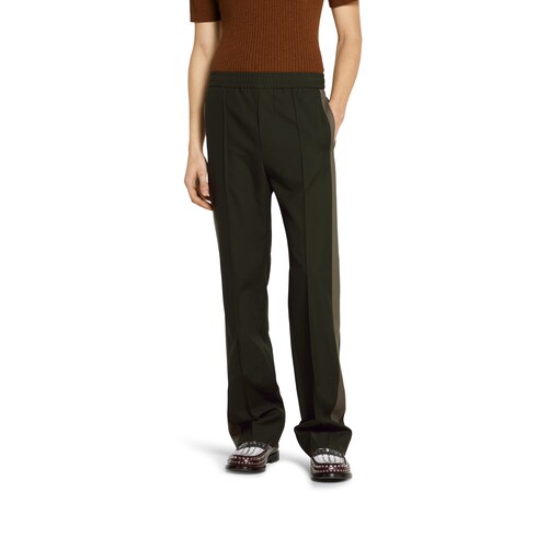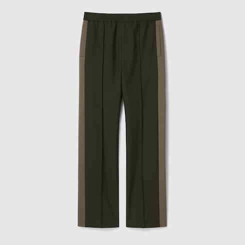 Los diseños de Pre-Fall 2025 en sutiles tonos negros, grises y verdes se destacan con detalles artesanales como delicados bordados florales y logotipos en relieve. Estos pantalones se han confeccionado en sarga de lana verde bosque con un logotipo Gucci en relieve en la parte posterior y unas rayas laterales en contraste.