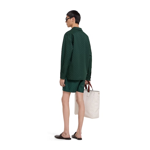 El emblema GG, que se aplica con diferentes técnicas textiles a la colección, aporta riqueza visual. Confeccionada en lona GG verde oscuro, esta camisa cuenta con un cuello abierto y aberturas laterales.