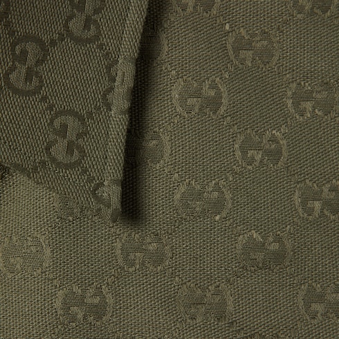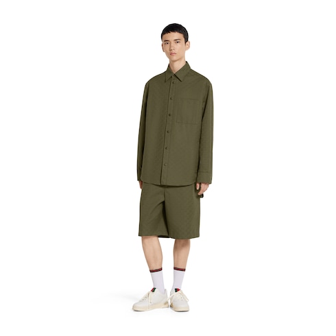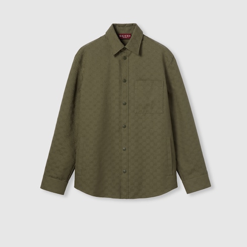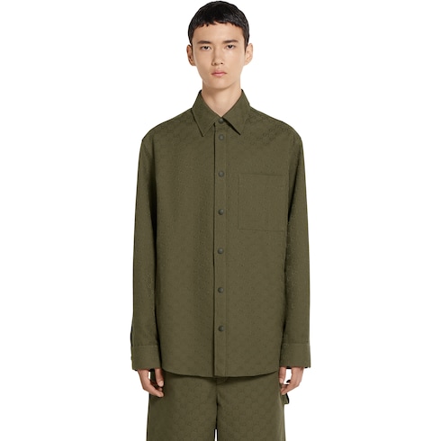 Los diseños de Pre-Fall 2025 en sutiles tonos negros, grises y verdes se destacan con detalles artesanales como delicados bordados florales y logotipos en relieve. Esta camisa de lona verde bosque se realza con el exclusivo monograma GG.