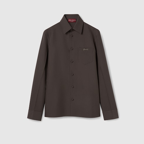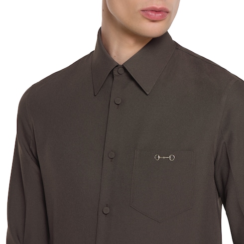 En la colección Otoño Invierno 2025, los códigos clásicos de Gucci realzan una silueta estilizada. Esta camisa de corte ajustado exhibe un detalle de Horsebit de metal en el bolsillo del pecho. El diseño se completa con el cierre abotonado oculto, el cuello de punta y las mangas largas.