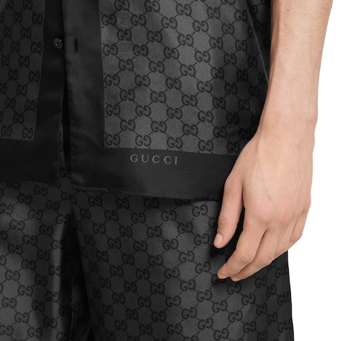 La colección Pre-Fall 2025 eleva los looks de diario con una combinación de texturas, motivos y colores. Esta camisa de ajuste normal se ha confeccionado en sarga de seda negra y gris con un estampado GG integral.