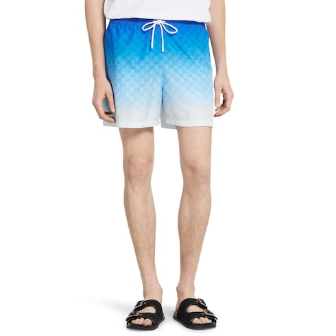 Los colores degradados se crean meticulosamente para resaltar la textura de los materiales y el inconfundible motivo GG. Este bañador de popelina técnica azul degradado cuenta con un estampado GG integral.