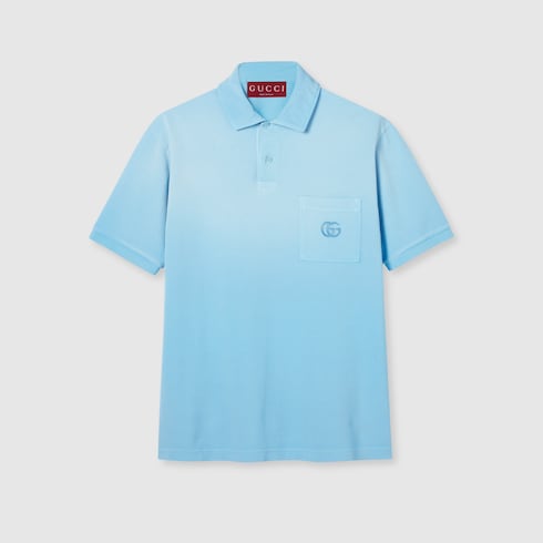 Los colores degradados se crean meticulosamente para resaltar la textura de los materiales y los inconfundibles motivos Gucci. Este polo se ha confeccionado en piqué de algodón degradado de azul claro a azul y se realza con un bordado de Doble G.