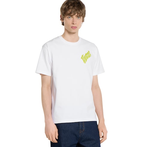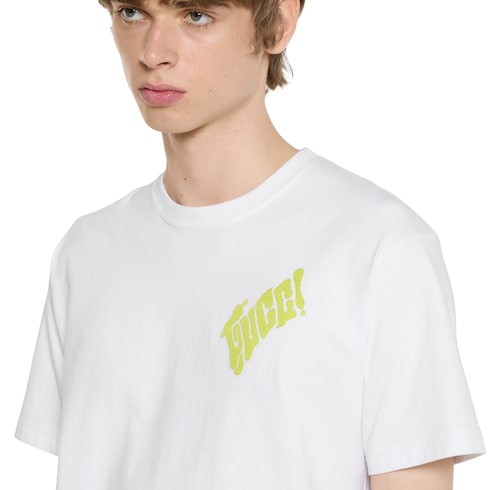 El artista chino Currynew (Xiang Zhang) aporta su toque personal al logotipo de la Firma en la selección de prendas ready-to-wear, artículos de marroquinería y accesorios de la colección Pre-Fall 2025. Esta camiseta de punto de algodón blanco exhibe un bordado Gucci en la parte delantera y un estampado Gucci en la parte trasera.