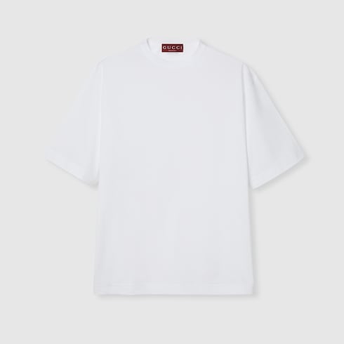 La colección Pre-Fall 2025 combina a la perfección texturas versátiles y detalles sofisticados. Esta camiseta oversize de punto de algodón blanco cuenta con un detalle de presilla con tribanda Web.