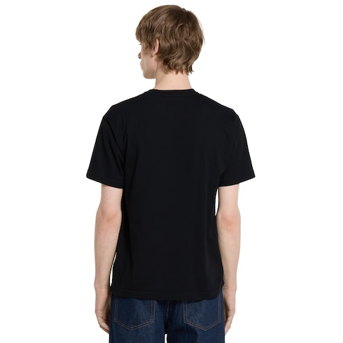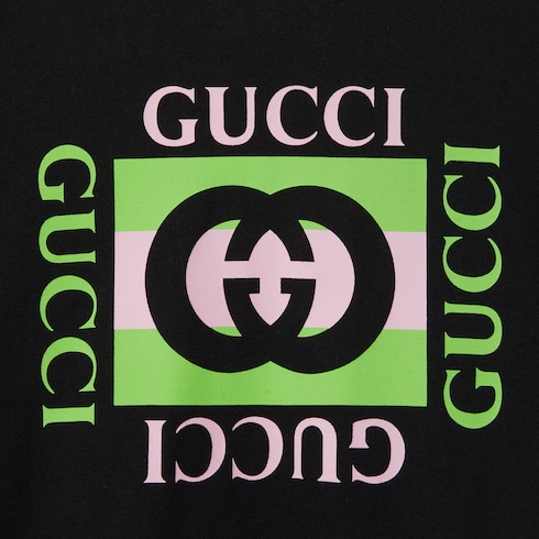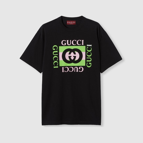 Las prendas para el día a día se realzan con un detalle Gucci de selvedge o un estampado de logotipo Gucci vintage que les confieren un toque urbano. Esta camiseta de punto de algodón negro se caracteriza por un estampado de Gucci, GG entrelazada y rayas.
