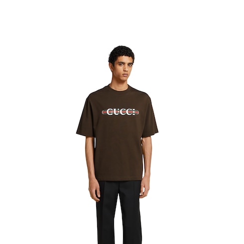 La colección Pre-Fall 2025 destaca por los diseños clásicos de día y de noche con detalles emblemáticos. Esta camiseta de punto de algodón grueso marrón se realza con un estampado Gucci con tribanda Web.