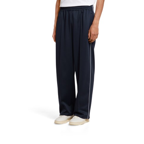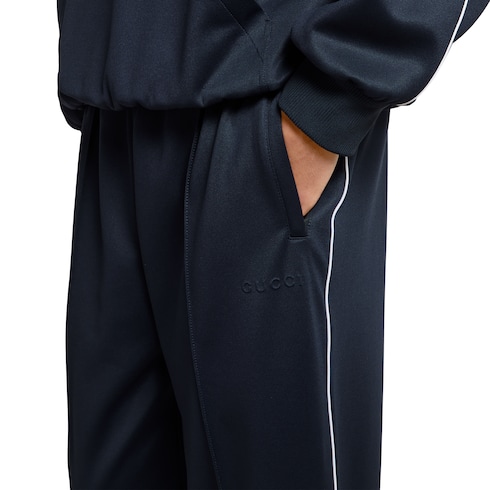 En la colección Pre-Fall 2025, los motivos de inspiración marítima como rayas y anclas se combinan con el logotipo de la Firma para realzar diseños informales perfectos para disfrutar junto al mar. Estos pantalones de punto técnico azul marino se realzan con un ribete en contraste y un logotipo Gucci en relieve.