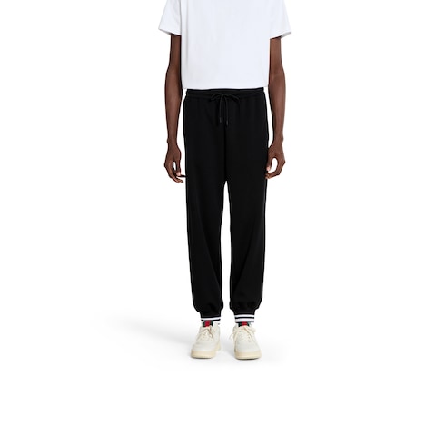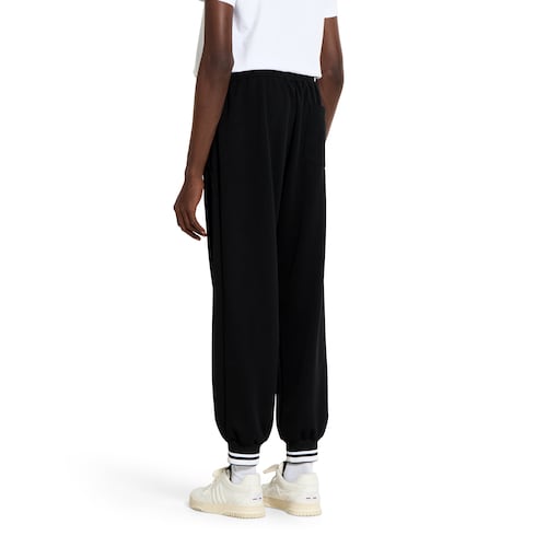 La colección Pre-Fall 2025 destaca por los diseños clásicos de día y de noche con detalles emblemáticos. Estos pantalones deportivos de ajuste holgado se han confeccionado en punto técnico negro y se completan con un logotipo de Gucci en relieve.