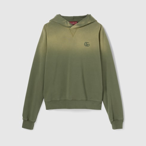 Los diseños de Pre-Fall 2025 en sutiles tonos negros, grises y verdes se destacan con detalles artesanales como delicados bordados florales y logotipos en relieve. Esta sudadera de punto de algodón verde bosque se adorna con un bordado de Doble G.