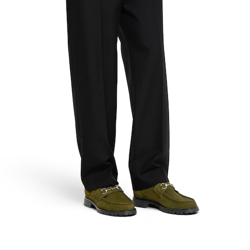 En la colección Otoño Invierno 2025, en la última colección de Gucci, las siluetas esenciales se realzan con detalles emblemáticos. Este par de botines en ante marrón se caracteriza por un emblemático Horsebit plateado. La suela dentada de goma completa el estilo.