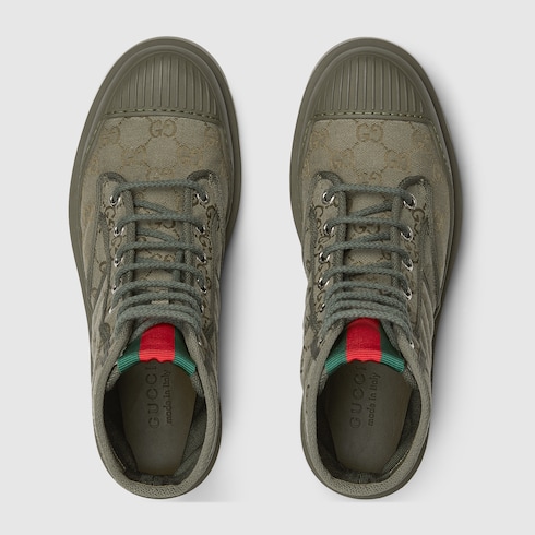 En la colección Otoño Invierno 2025, la tribanda Web verde y roja define estas botas para hombre fabricadas en lona GG. El motivo característico recuerda los orígenes de la Firma y resalta la artesanía de este diseño estilizado.