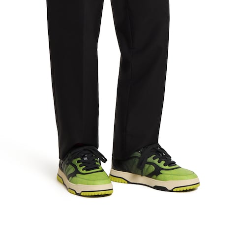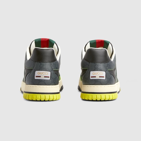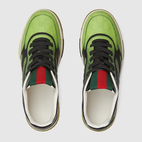 La línea Re-Web incluye las clásicas rayas de Gucci a modo de detalle llamativo en un diseño contemporáneo. Estas zapatillas de GG Supreme verde degradado se caracterizan por sus detalles exclusivos y se completan con una lengüeta con la tribanda Web verde y roja.