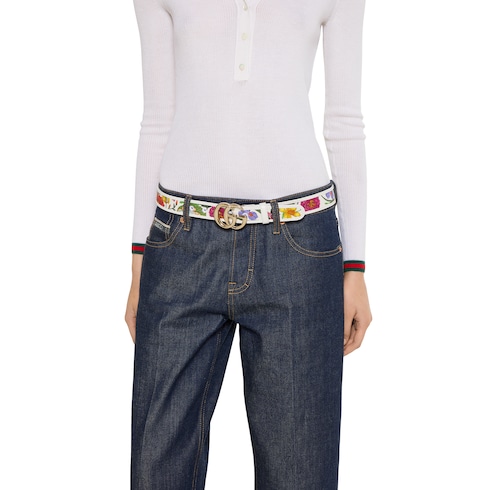 Algunos de los cinturones más inconfundibles de la Firma se realzan con un alegre motivo floral que les aporta un toque primaveral. Este cinturón GG Marmont de tejido exhibe un estampado Flora integral y una hebilla de Doble G.