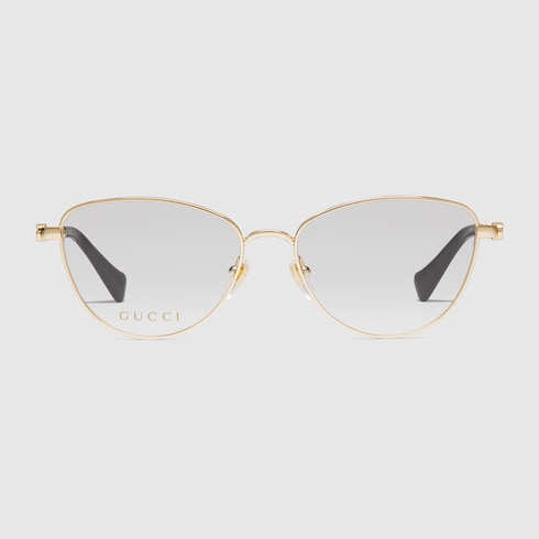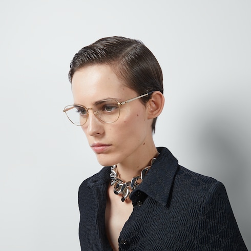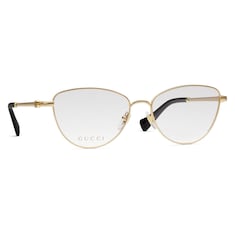 Entre las gafas de vista de la colección Cruise 2024 se incluyen diseños clásicos con montura rectangular y modelos retro de ojo de gato. Las versiones del motivo de la Firma en las patillas añaden un toque de elegancia y exclusividad. Este modelo con montura de ojo de gato en metal dorado se completa con una Doble G y las puntas de acetato.
