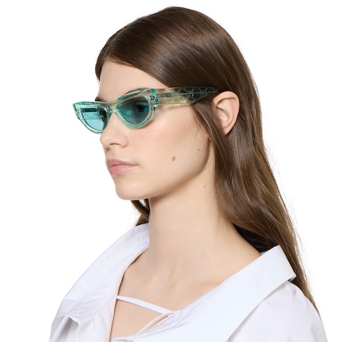 La colección de gafas Pre-Fall 2025 presenta el motivo Guccissima en un tono y una silueta llamativos. Estas gafas de sol de ojo de gato están fabricadas en acetato con un motivo GG por toda la superficie. Los cristales en turquesa liso completan el modelo.