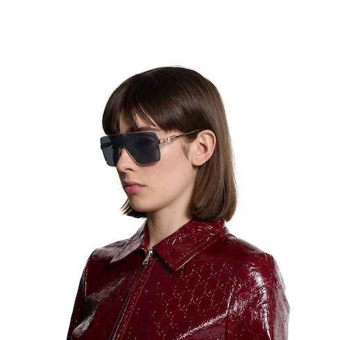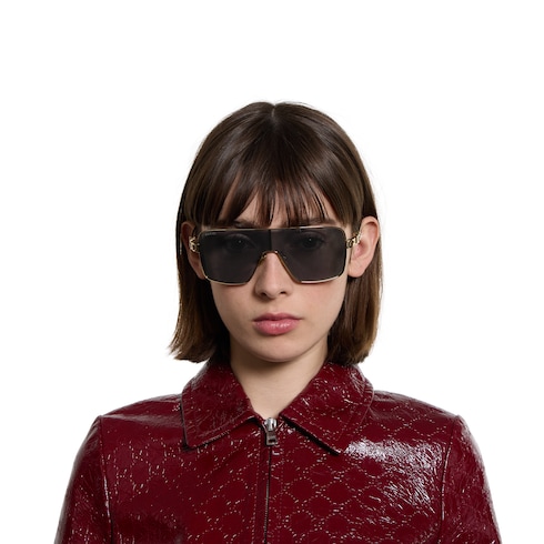 La colección de gafas Pre-Fall 2025 cuenta con clásicos de estilo contemporáneo. Estas gafas de sol rectangulares se han fabricado en metal dorado claro con un detalle de logotipo Gucci perforado.