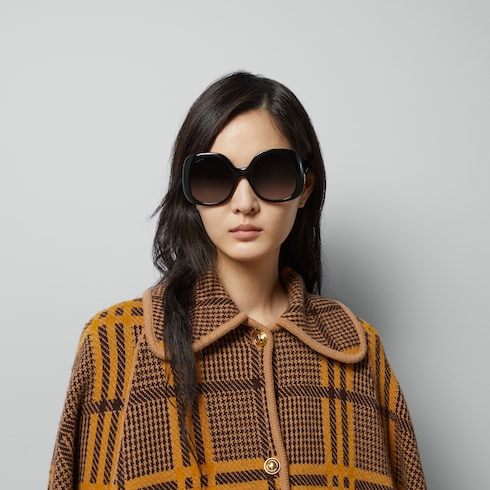La estructura de estas gafas de sol extragrandes se caracteriza por el aspecto ondulado de sus patillas, que añade un elemento de fluidez al diseño. El estilo de inyección en negro se completa con un motivo de GG en tono dorado.