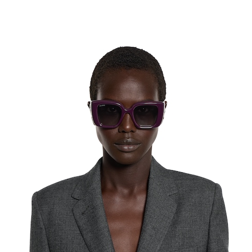 La colección de gafas Pre-Fall 2025 combina a la perfección los codiciados diseños de épocas pasadas y una estética contemporánea con el logotipo de la Firma. En este modelo, la montura de inyección morado oscuro se une a un detalle de Doble G.