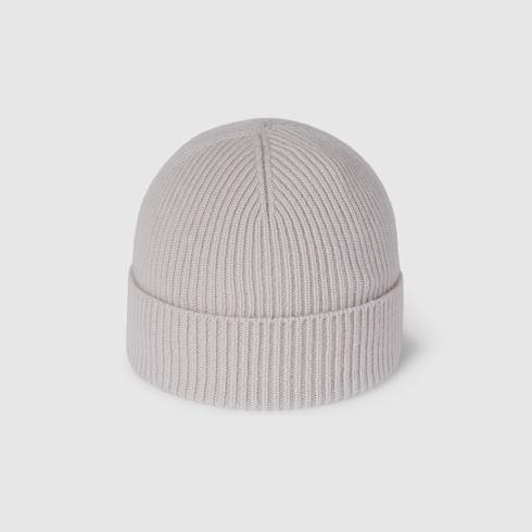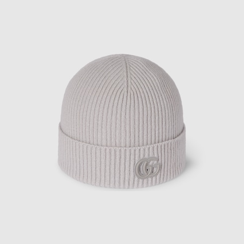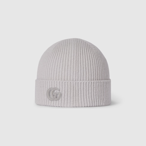 Los accesorios suaves y de seda de la colección Pre-Fall 2025 presentan los códigos de la Firma en sofisticados adornos, parches con logotipos y sutiles bordados. Este gorro de cashmere exhibe un parche de piel con Doble G en el mismo tono.