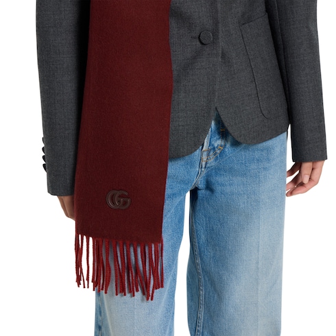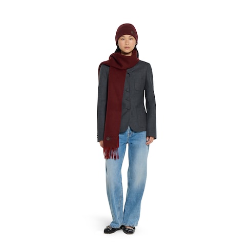 Los accesorios suaves y de seda de la colección Pre-Fall 2025 presentan los códigos de la Firma en sofisticados adornos, parches con logotipos y sutiles bordados. Este gorro de cashmere exhibe un parche de piel con Doble G en el mismo tono.