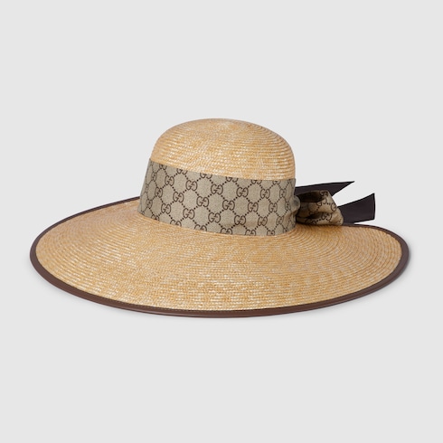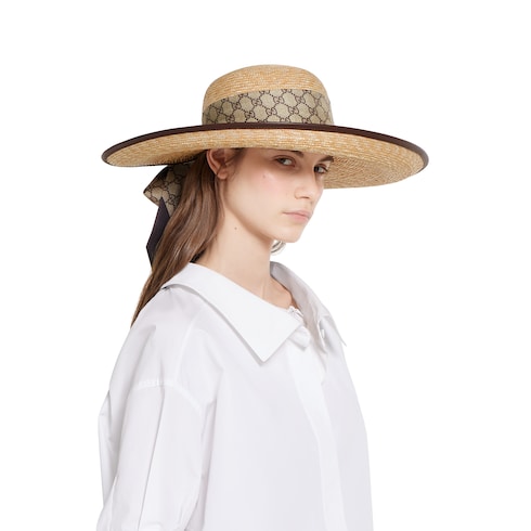 Los accesorios suaves de la colección Pre-Fall 2025 presentan los códigos de la Firma con sofisticados adornos, parches con logotipos y sutiles bordados. Este sombrero de ala ancha en paja natural se realza con un lazo de seda con estampado GG.