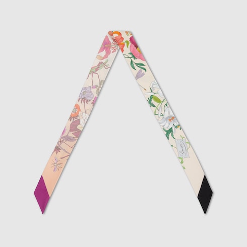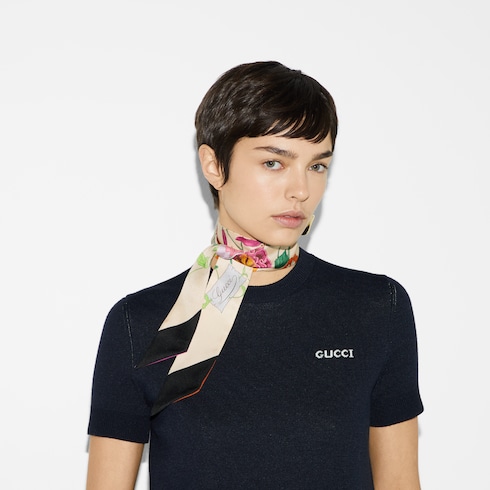 Este elegante lazo de seda destaca con un llamativo estampado floral Gucci, que reinterpreta uno de los códigos más famosos de la Firma. Con una base de seda azul marino y rosa, su diseño explora una gama de motivos diferentes en función de cómo se lleve.