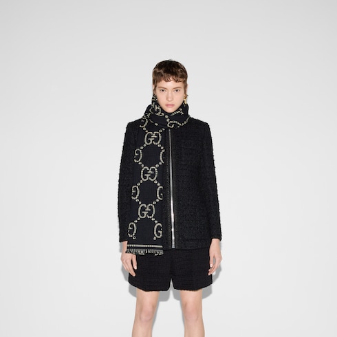 El distintivo motivo GG, que forma parte de los códigos de la Firma que se presentaron por primera vez en los años 30, ha servido de inspiración para nuevas expresiones experimentales durante casi un siglo. Se presenta como una versión a cuadros en esta bufanda de lana.