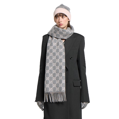 Los accesorios suaves y de seda de la colección Pre-Fall 2025 presentan los códigos de la Firma en sofisticados adornos, parches con logotipos y sutiles bordados. Esta bufanda se ha fabricado en cashmere con GG y un ribete de flecos.